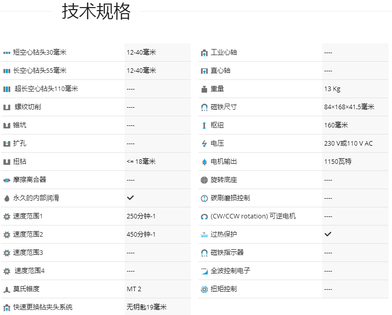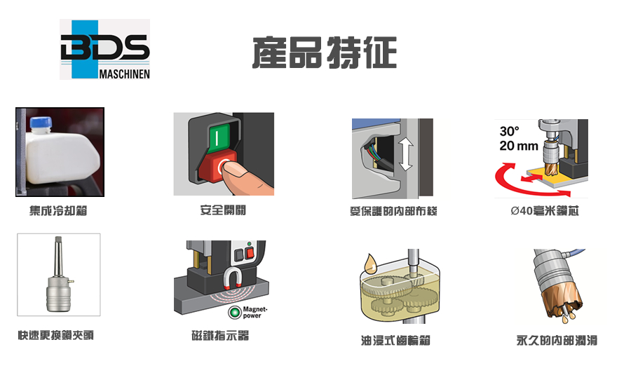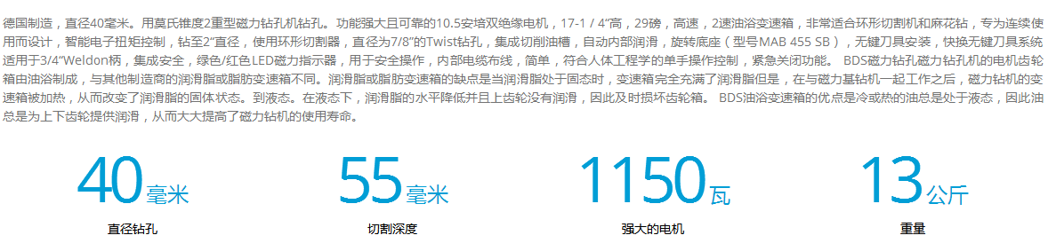 介紹:德國制造,直徑40毫米。用莫氏錐度2重型磁力鉆孔機(jī)鉆孔。功能強(qiáng)大且可靠的10.5安培雙絕緣電機(jī),17-1 / 4“高,29磅,高速,2速油浴變速箱,非常適合環(huán)形切割機(jī)和麻花鉆,專為連續(xù)使用而設(shè)計(jì),智能電子扭矩控制,鉆至2“直徑,使用環(huán)形切割器,直徑為7/8”的Twist鉆孔,集成切削油槽,自動內(nèi)部潤滑,旋轉(zhuǎn)底座(型號MAB 455 SB),無鍵刀具安裝,快換無鍵刀具系統(tǒng)適用于3/4“Weldon柄,集成安全,綠色/紅色LED磁力指示器,用于安全操作,內(nèi)部電纜布線,簡單,符合人體工程學(xué)的單手操作控制,緊急關(guān)閉功能。 BDS磁力鉆孔磁力鉆孔機(jī)的電機(jī)齒輪箱由油浴制成,與其他制造商的潤滑脂或脂肪變速箱不同。潤滑脂或脂肪變速箱的缺點(diǎn)是當(dāng)潤滑脂處于固態(tài)時(shí),變速箱完全充滿了潤滑脂但是,在與磁力基鉆機(jī)一起工作之后,磁力鉆機(jī)的變速箱被加熱,從而改變了潤滑脂的固體狀態(tài)。到液態(tài)。在液態(tài)下,潤滑脂的水平降低并且上齒輪沒有潤滑,因此及時(shí)損壞齒輪箱。 BDS油浴變速箱的優(yōu)點(diǎn)是冷或熱的油總是處于液態(tài),因此油總是為上下齒輪提供潤滑,從而大大提高了磁力鉆機(jī)的使用壽命。