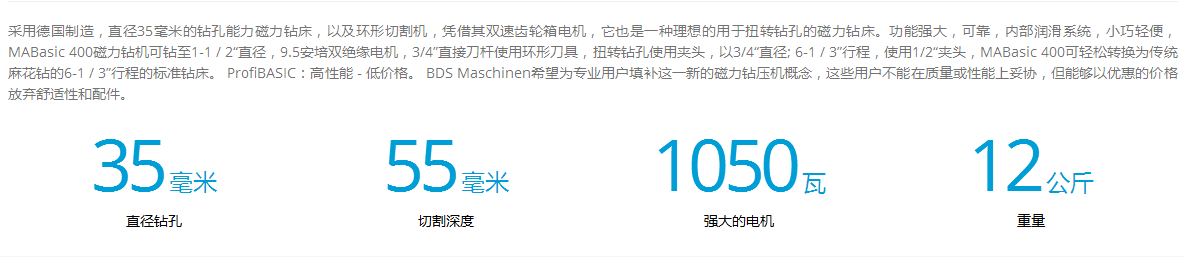 介紹:采用德國制造,直徑35毫米的鉆孔能力磁力鉆床,以及環(huán)形切割機,憑借其雙速齒輪箱電機,它也是一種理想的用于扭轉(zhuǎn)鉆孔的磁力鉆床。功能強大,可靠,內(nèi)部潤滑系統(tǒng),小巧輕便,MABasic 400磁力鉆機可鉆至1-1 / 2“直徑,9.5安培雙絕緣電機,3/4”直接刀桿使用環(huán)形刀具,扭轉(zhuǎn)鉆孔使用夾頭,以3/4“直徑; 6-1 / 3”行程,使用1/2“夾頭,MABasic 400可輕松轉(zhuǎn)換為傳統(tǒng)麻花鉆的6-1 / 3”行程的標準鉆床。 ProfiBASIC:高性能 - 低價格。 BDS Maschinen希望為專業(yè)用戶填補這一新的磁力鉆壓機概念,這些用戶不能在質(zhì)量或性能上妥協(xié),但能夠以優(yōu)惠的價格放棄舒適性和配件。